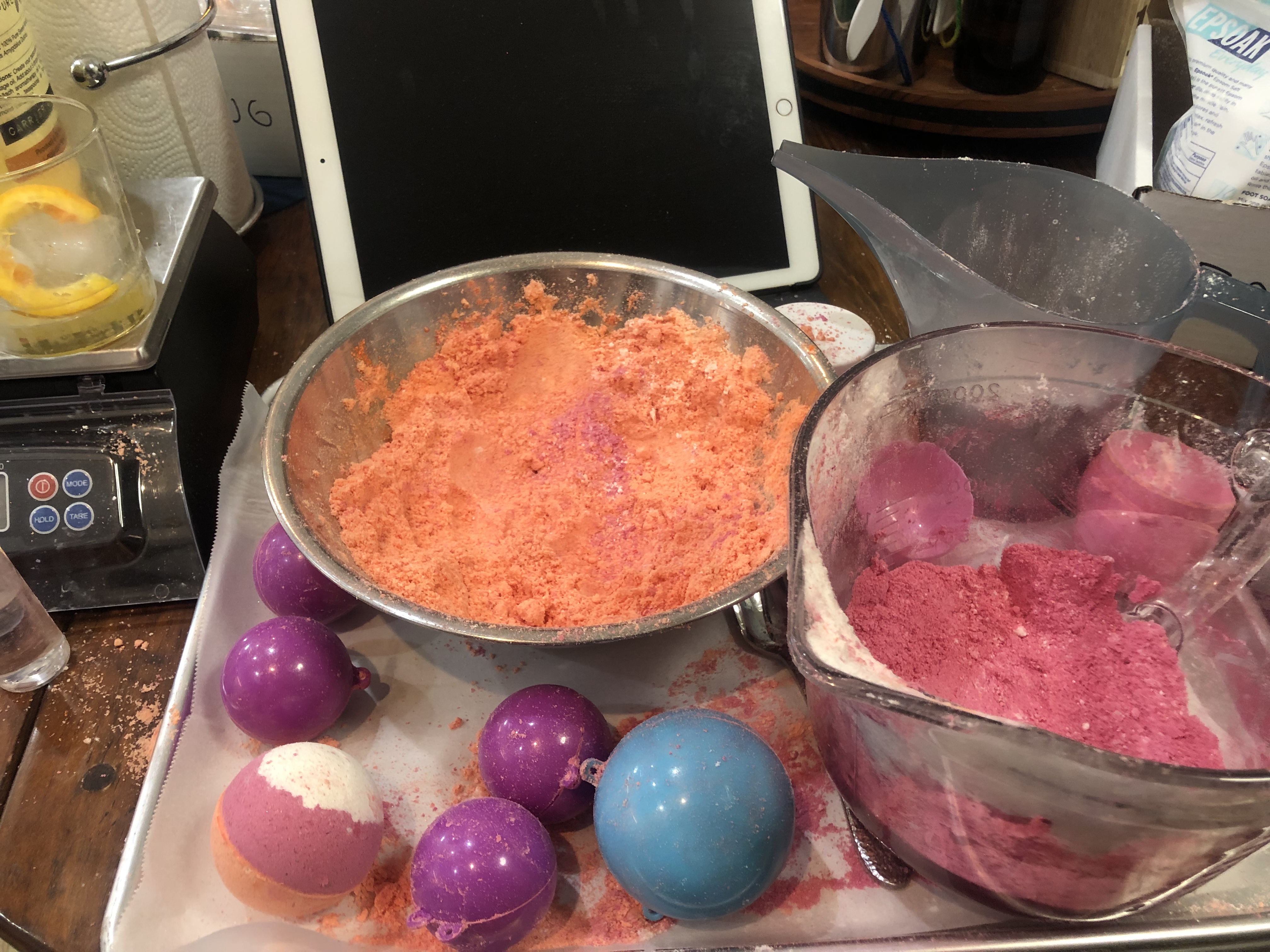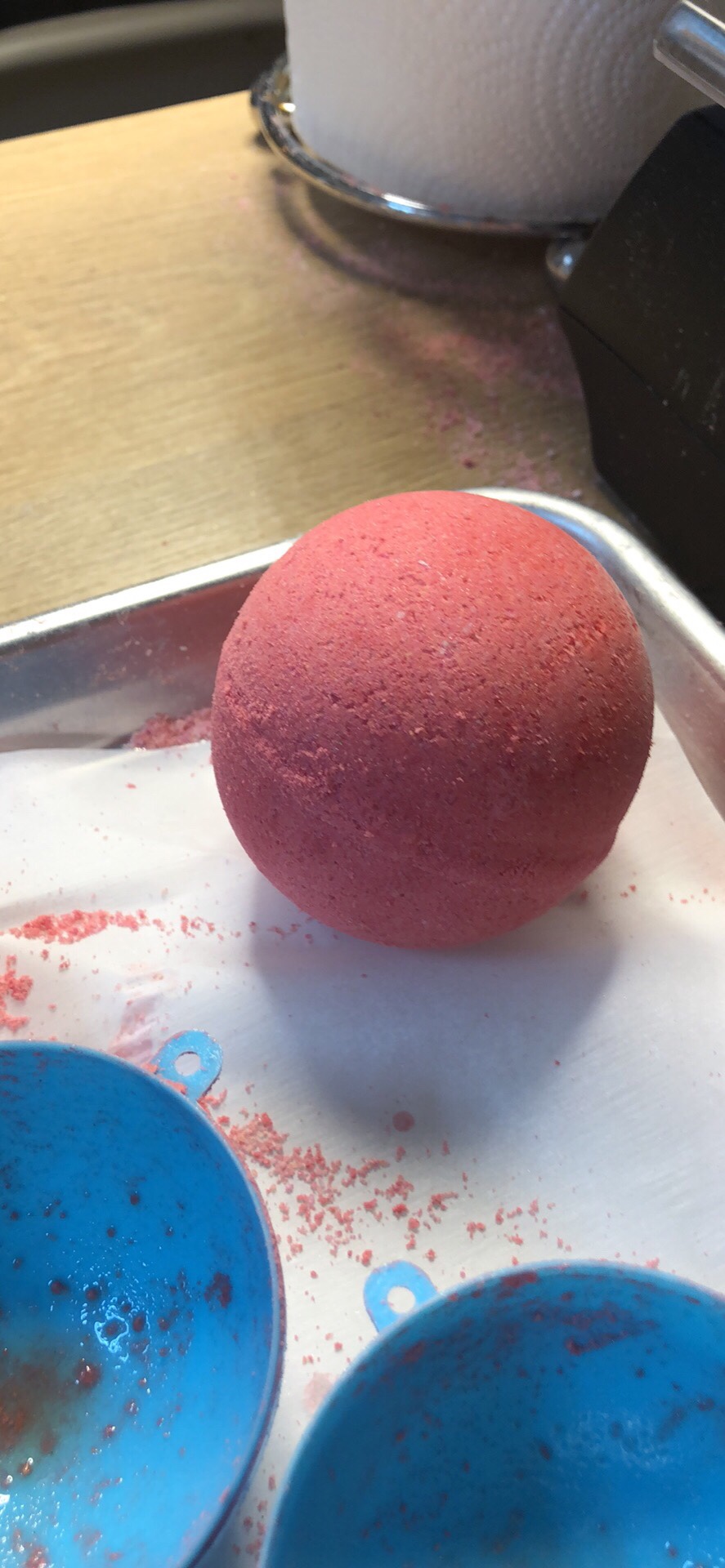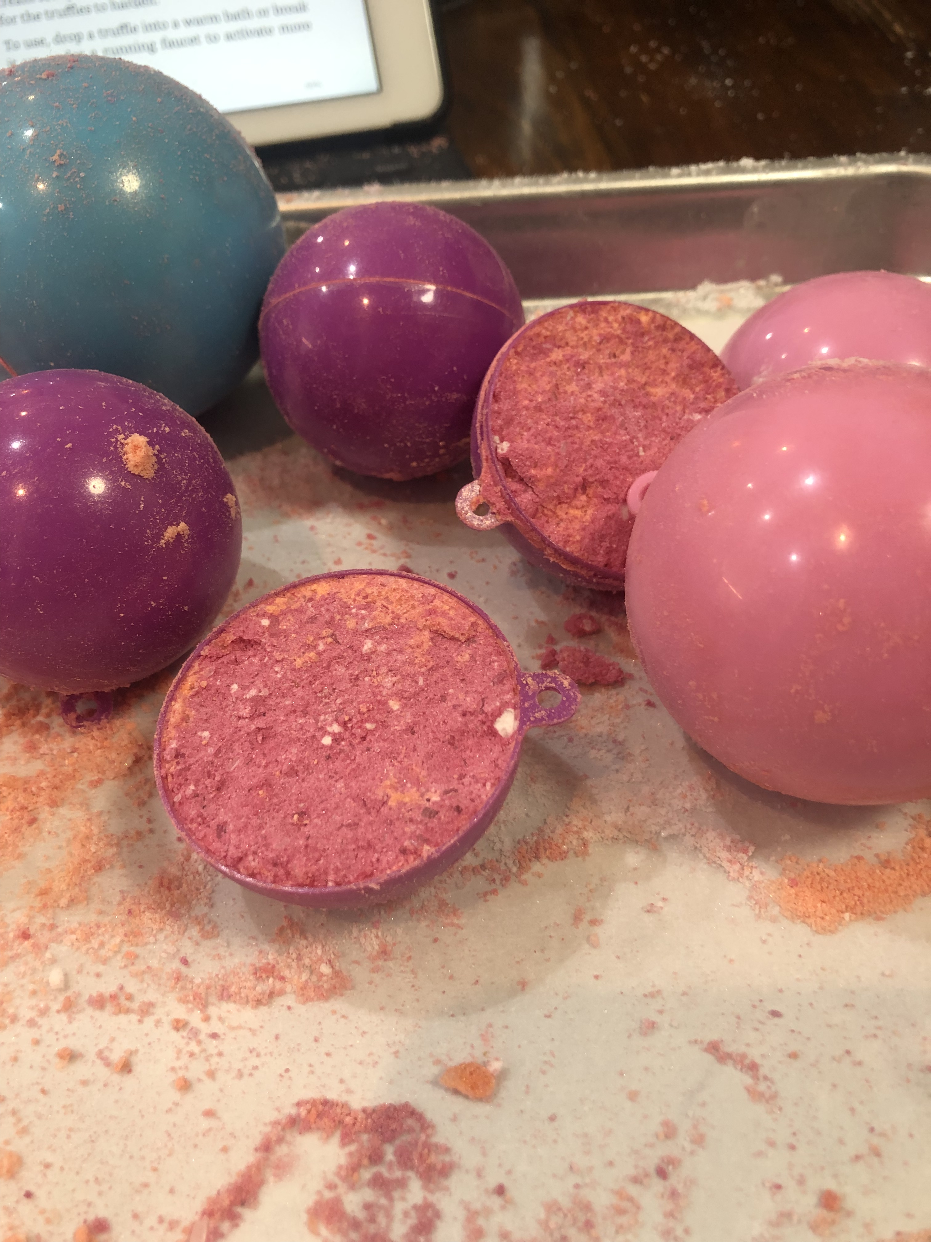 TONIGHT! I obliged. They look like they probably won’t stay together. I followed a new recipe out of a highly rated book, to a T. The book is called “Bathtub treats: a Guide to making Bath Bombs, Bath Truffles And Bath Melts at Home Using…” recipe “Anxiety Relief Bath Bombs.” Then I spritzed for moisture. I used witch hazel and alcohol as instructed. I tested the consistency, as instructed. I even checked the room humidity; 40%, and still.