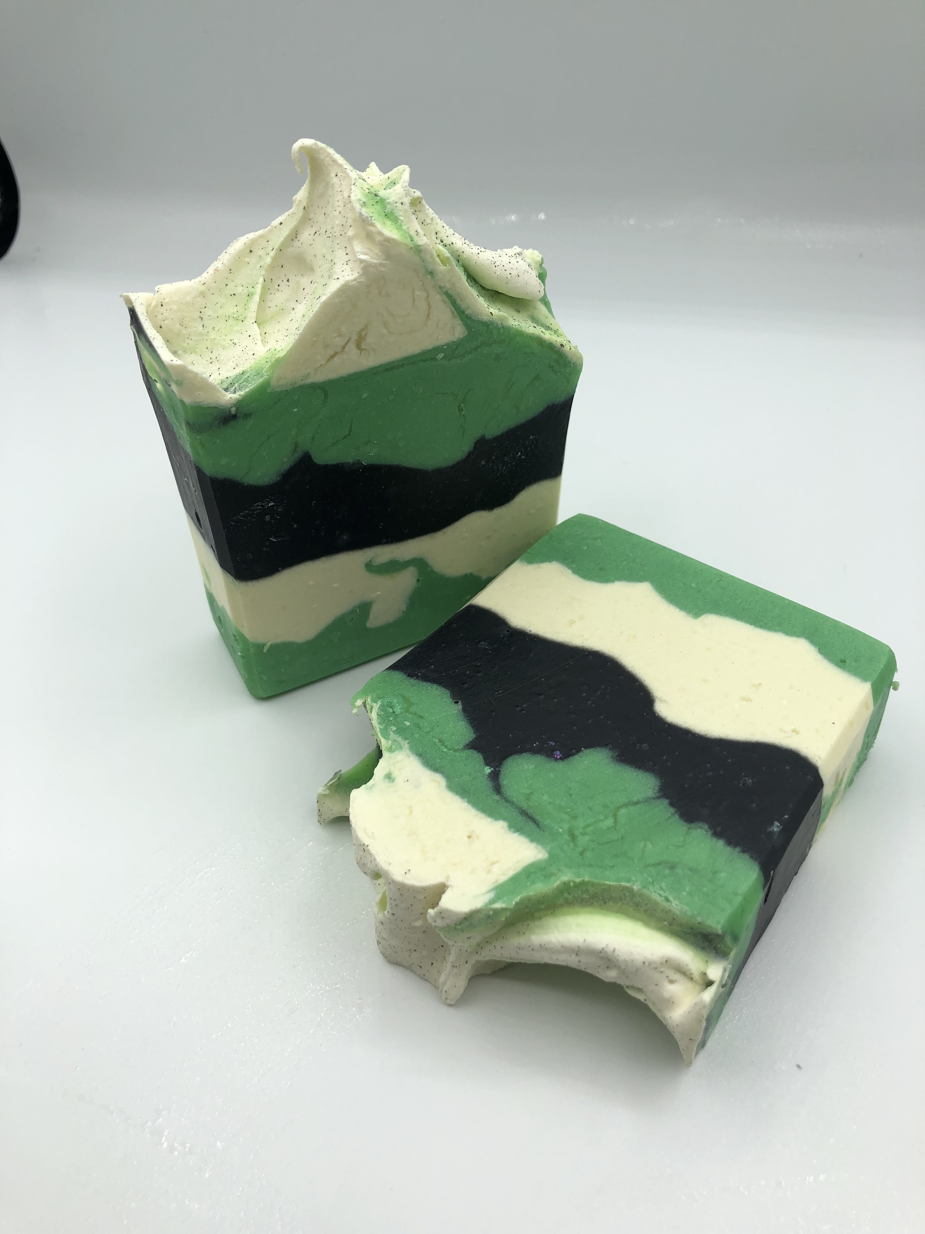 I decided to use the mica powder (green) in one loaf and leave the second loaf naturally colored with just the activated charcoal and the titanium dioxide I had remaining from the first loaf. Most of the second loaf was the uncolored batter that remained. I tried to do a swirl, but the batter accelerated so fast (even without color or scent) i had literally minutes. It became extremely thick. I mixed the lye and oils at 101 and 105 degrees.