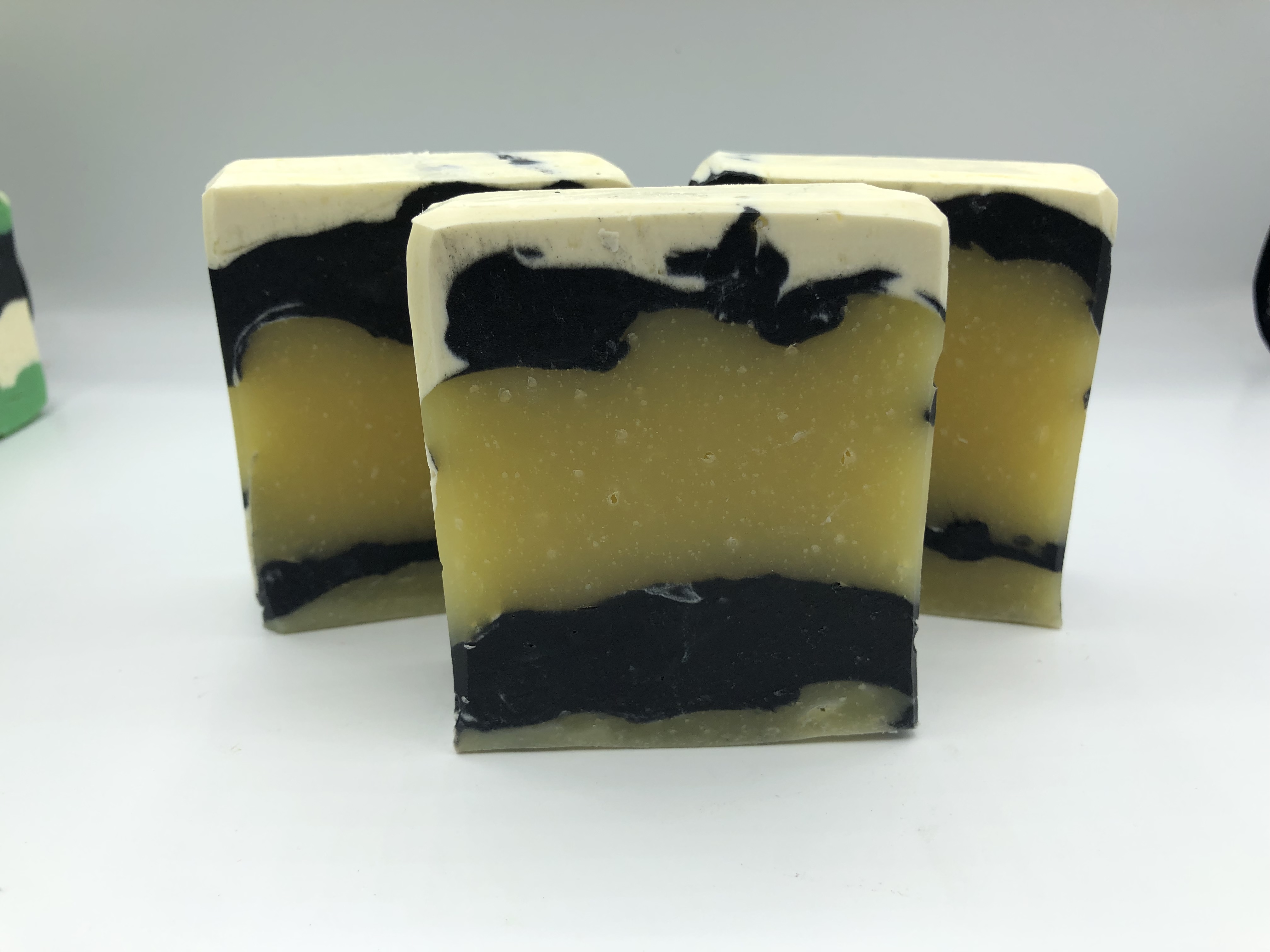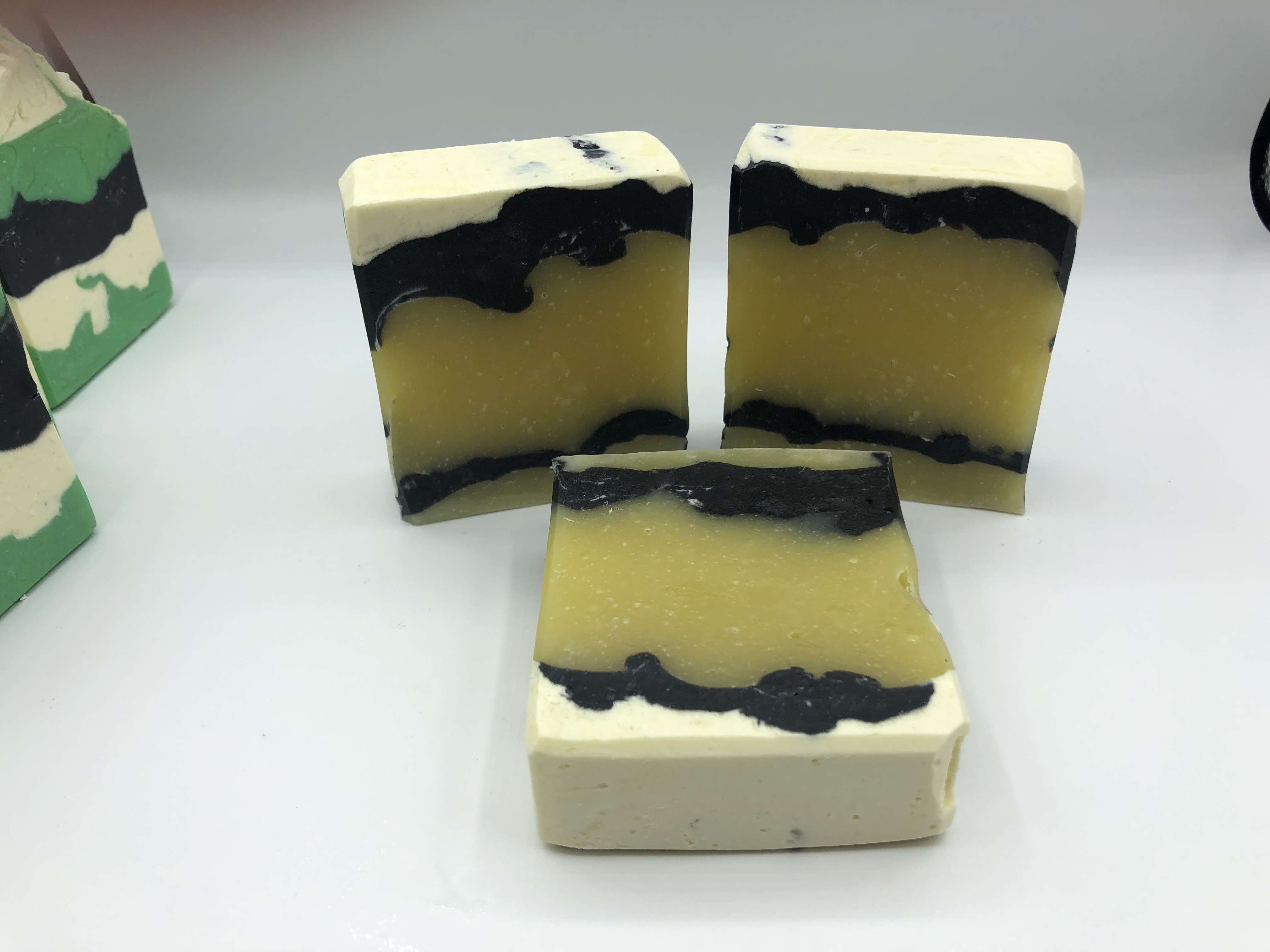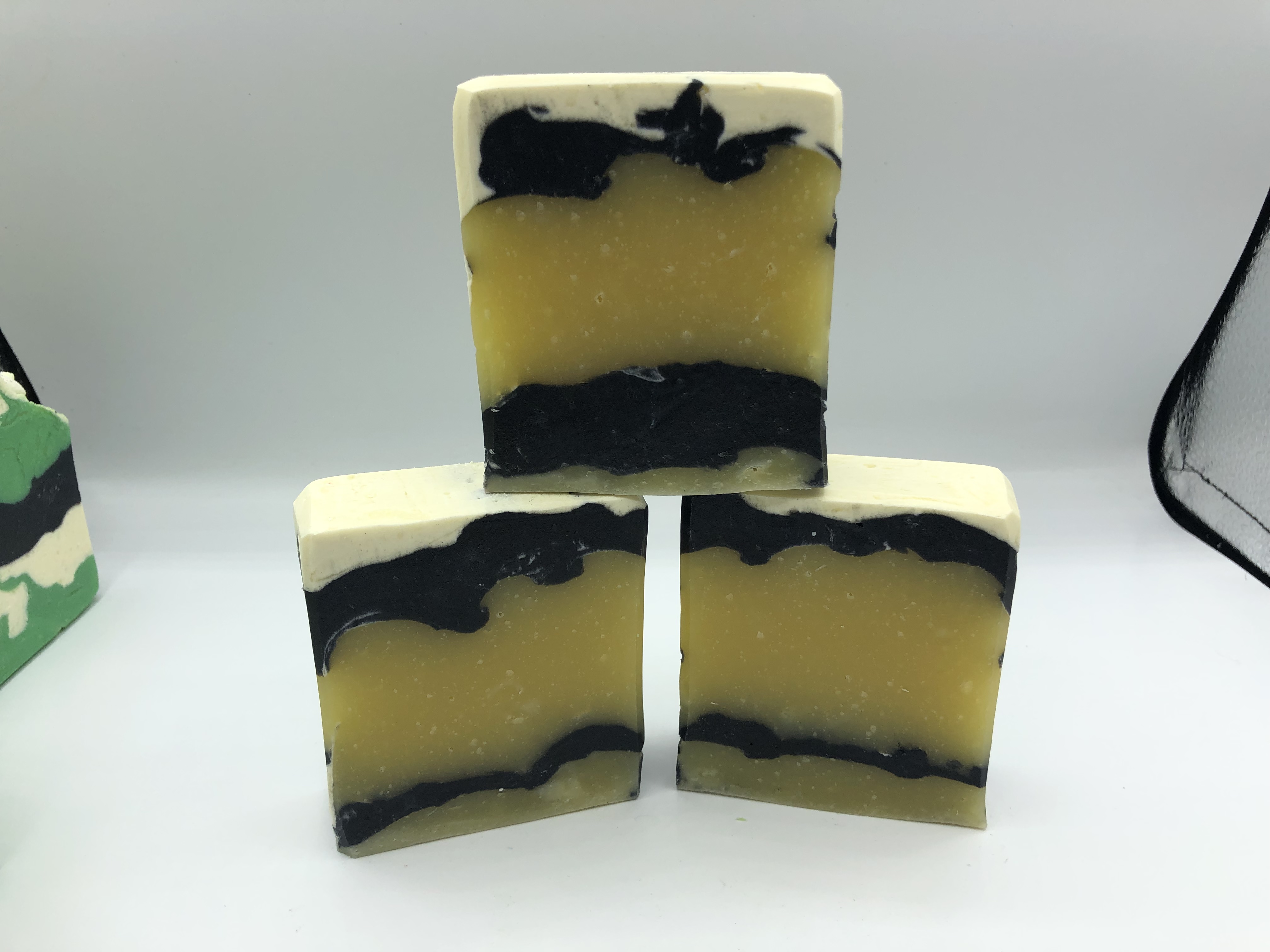 So today I made tea tree shampoo bars. I used the recipe from my original book, dividing the batter four times. I made two 42-44oz soap loaves, plus some leftover. I mixed green mica into one pitcher, oil and titanium dioxide into another, and the third had activated charcoal. The remaining batter (about half the total recipe) remained in the bucket, uncolored.